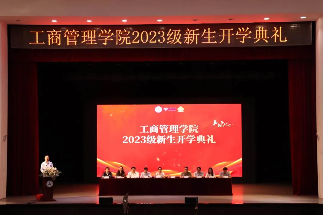 工商管理学院院长吴海涛,党委书记余小朋,副院长费显政、胡川、文豪、石军伟,院党委副书记李芳、朱艳平,教师代表杜鹏,以及各系主任、研究生导师组组长、本科班级导师、新生辅导员,与1037名本科、硕士、博士新生参加开学典礼。典礼由余小朋主持。