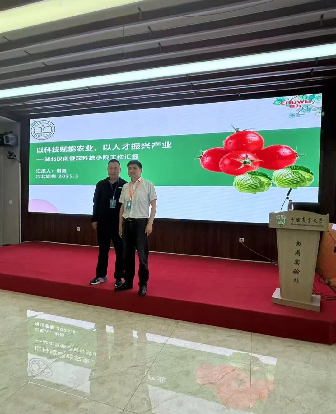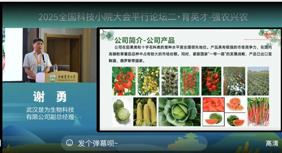 在5月9日上午的“育英才”分论坛上,谢总作《以科技赋能农业,以人才振兴产业——湖北汉南科技小院工作汇报》专题报告,介绍了依托楚为生物建设的湖北汉南番茄科技小院建设的实践与成效,通过校企合作、师生驻地研究,把高质量论文写在乡村大地上,致力于提高农业专业研究生实践创新综合能力,打造我国蔬菜生物育种产学研融合发展的样板,助力我国蔬菜种业高质量发展。